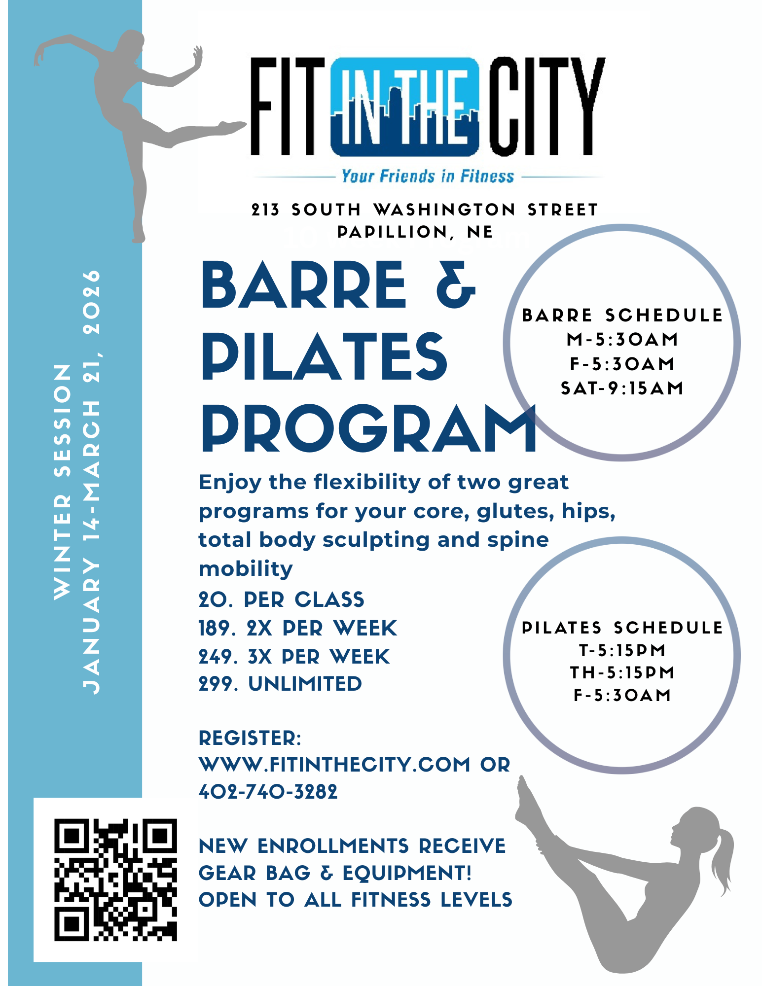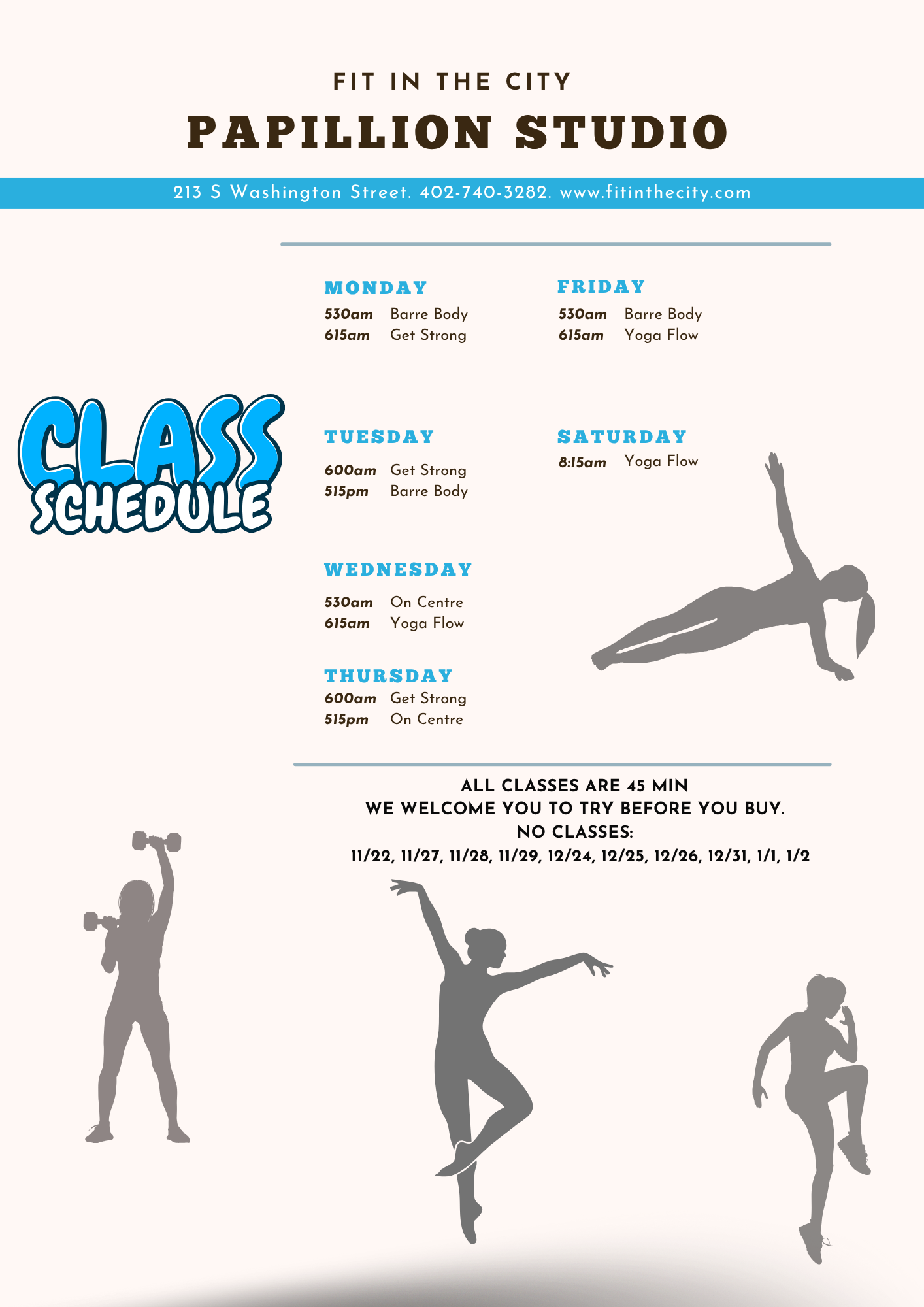 Join us for Barre, Pilates & Yoga class on our Current schedule posted at www.fitinthecity.com